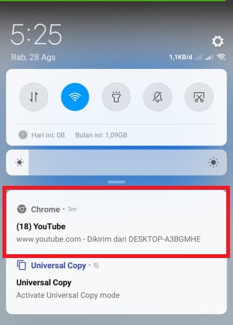 3. Maka akan muncul notifikasi bahwa link situs Youtube sudah terkirim ke smartphone Android kamu.