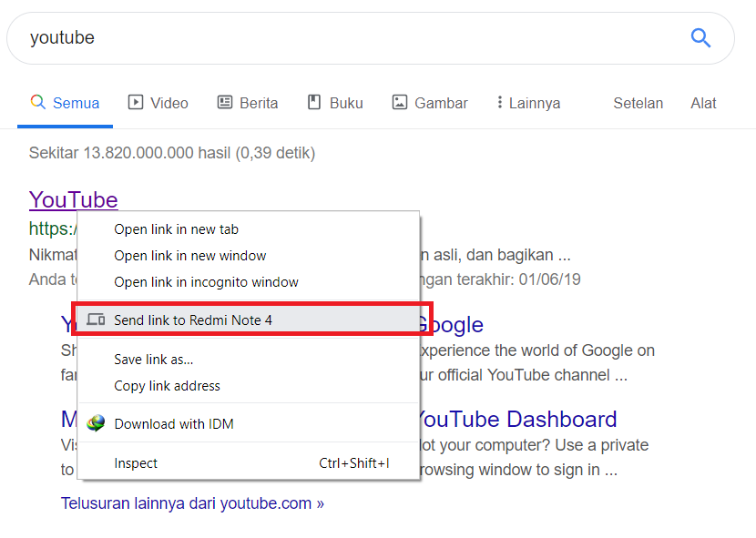 2. Cari sebuah url / link yang ingin kamu kirim ke perangkat Android kamu, misalnya untuk kasus penulis ingin mengirim url situs Youtube, kamu klik kanan pada url-nya dan klik pada tombol send link to xxxxxx dimana xxxxxxx adalah merk dari smartphone Android kamu.