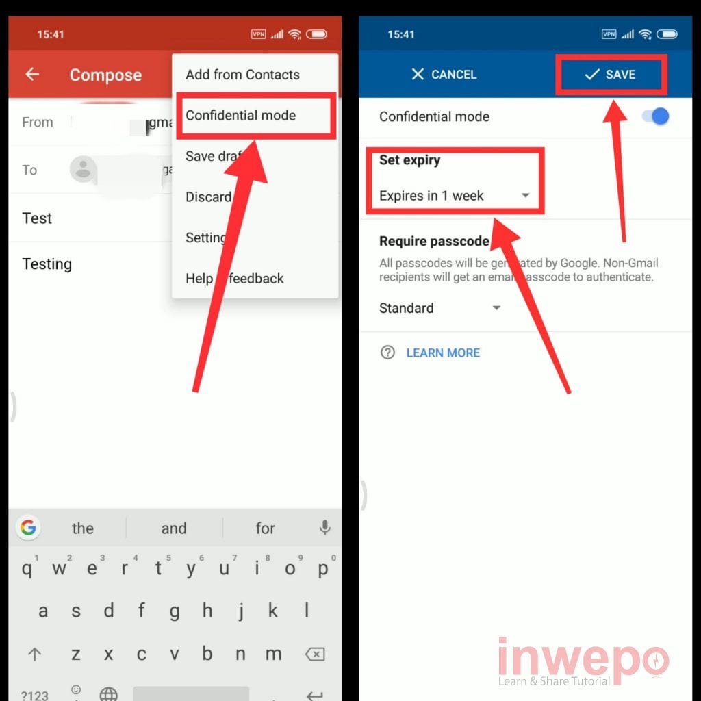 2. Tap menu Confidential mode lalu set pesan berakhir atau kadaluarsa menggunakan menu Set Expiry. Untuk passcode biarkan saja standard. Jika sudah tap SAVE.