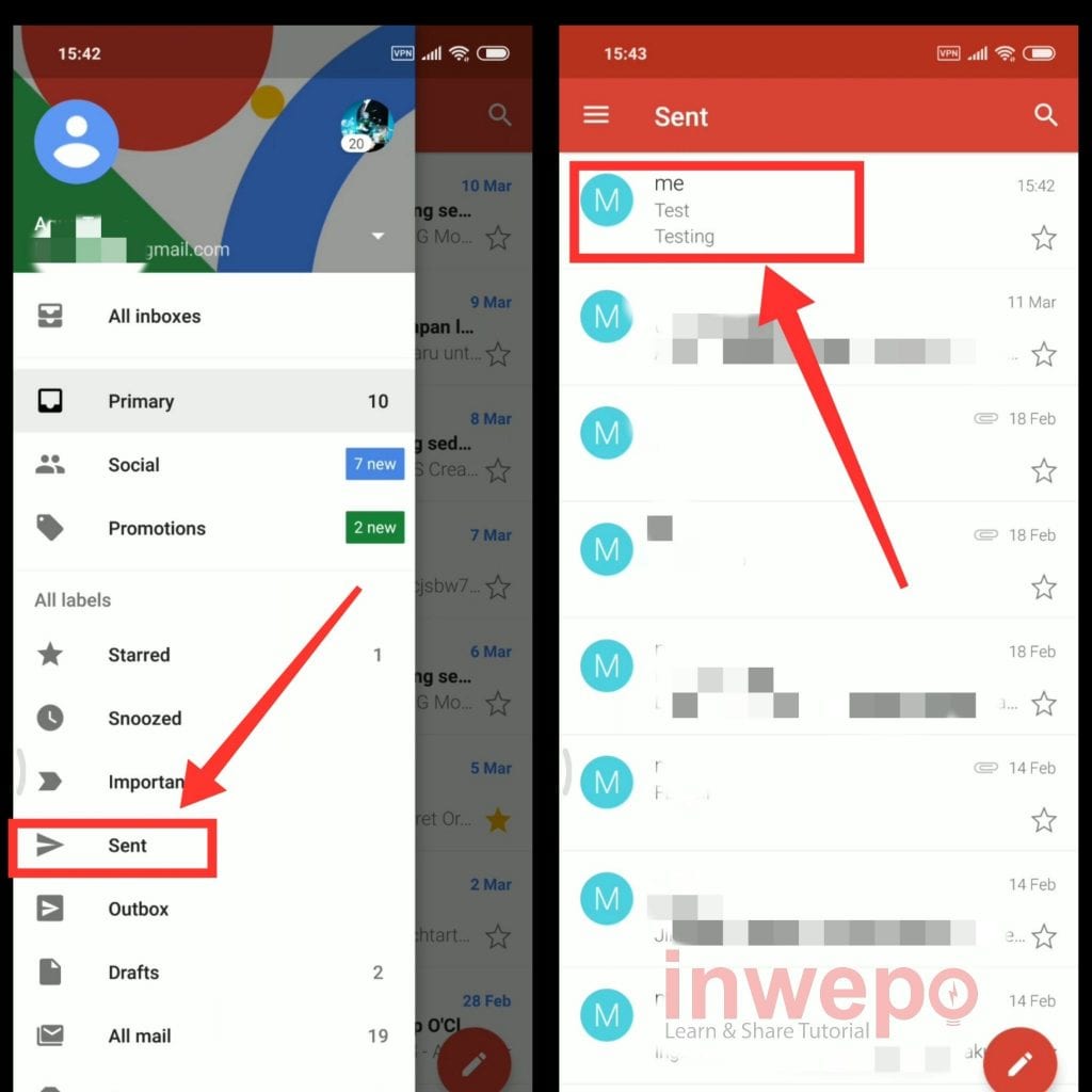4. Tap pada menu SENT kemudian buka lagi email yang sudah dikirim sebelumnya.