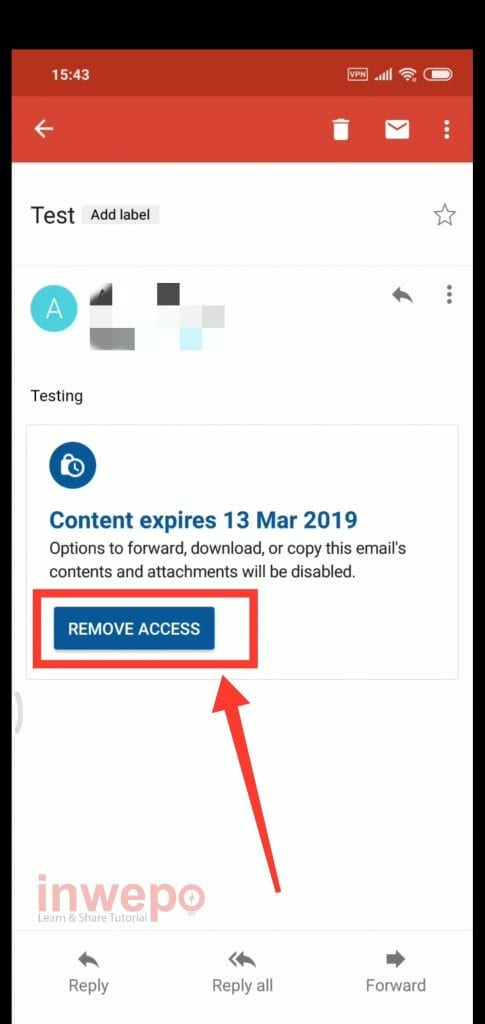 5. Langsung tap REMOVE ACCESS agar email tidak bisa di forward, copy dan dan secara otomatis juga terhapus di inbox penerima.