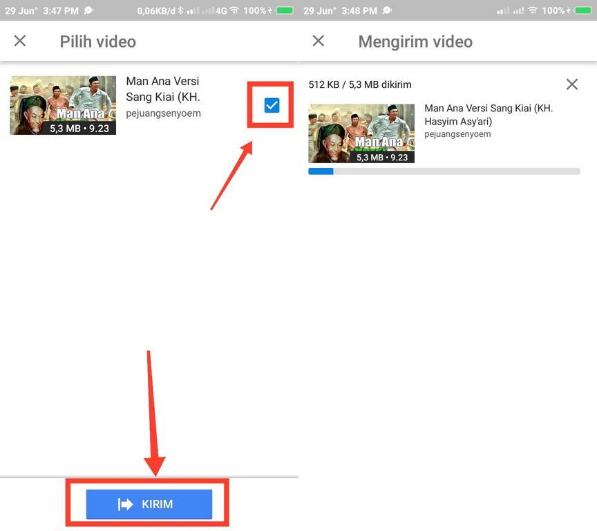 4. Dan tahapan terakhir, kamu klik kolom dan centang pada video yang sudah kamu download offline sebelumnya lalu pencet tombol kirim. Tunggu beberapa saat sampai proses pengirimannya selesai.