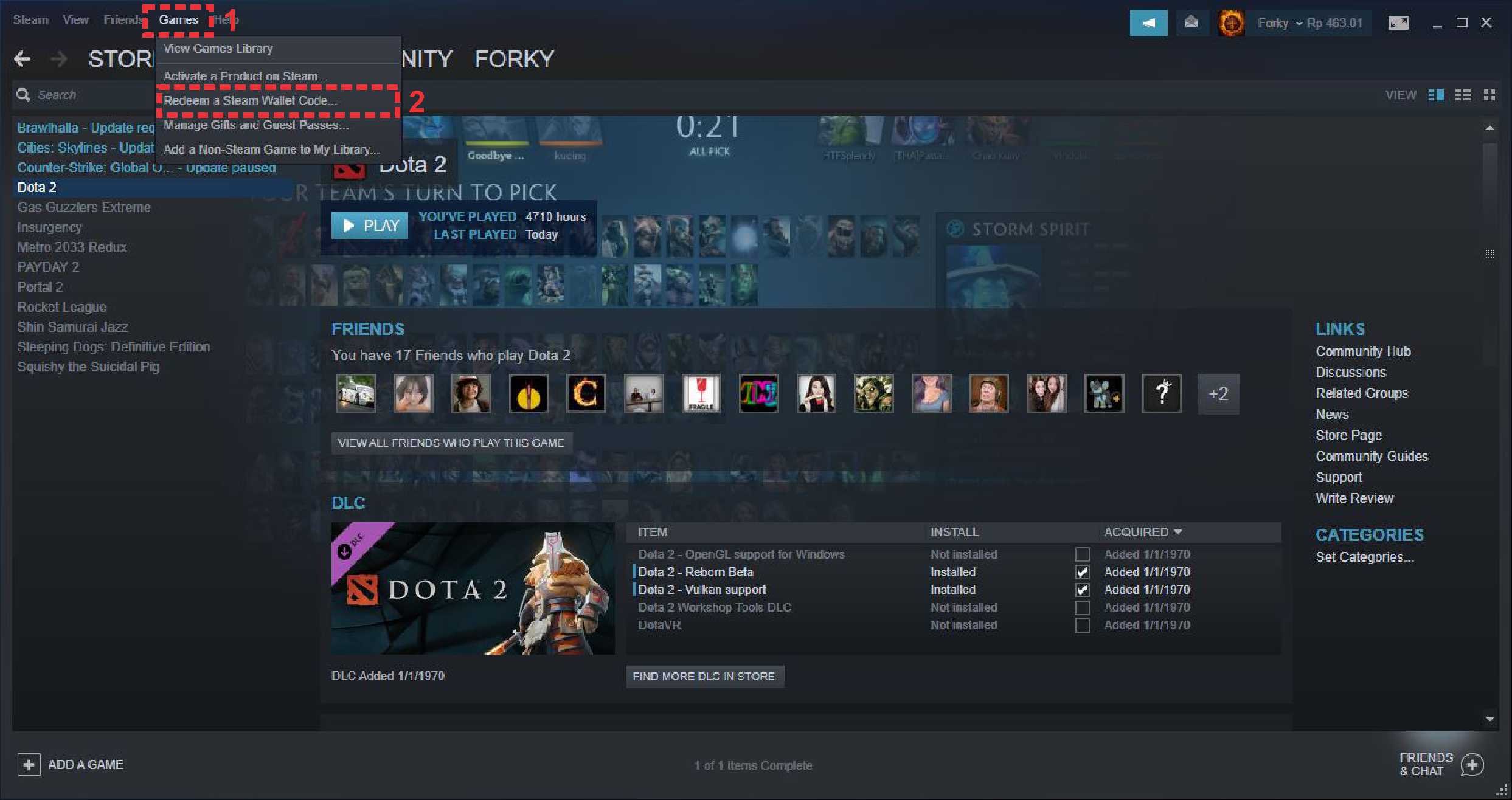 2. Pada menu utama, pilih pengaturan games kemudian pilih redeem a steam wallet code.