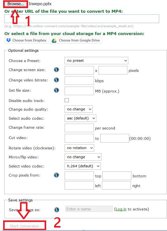 6. Silahkan kamu masukkan file powerpoint kamu dengan cara klik tombol Browse dan pilih file PPT yang ingin kamu ubah menjadi video, dan kemudian pilih Start conversion. Untuk kolom yang ada di tengah, kamu biarkan saja kosong.