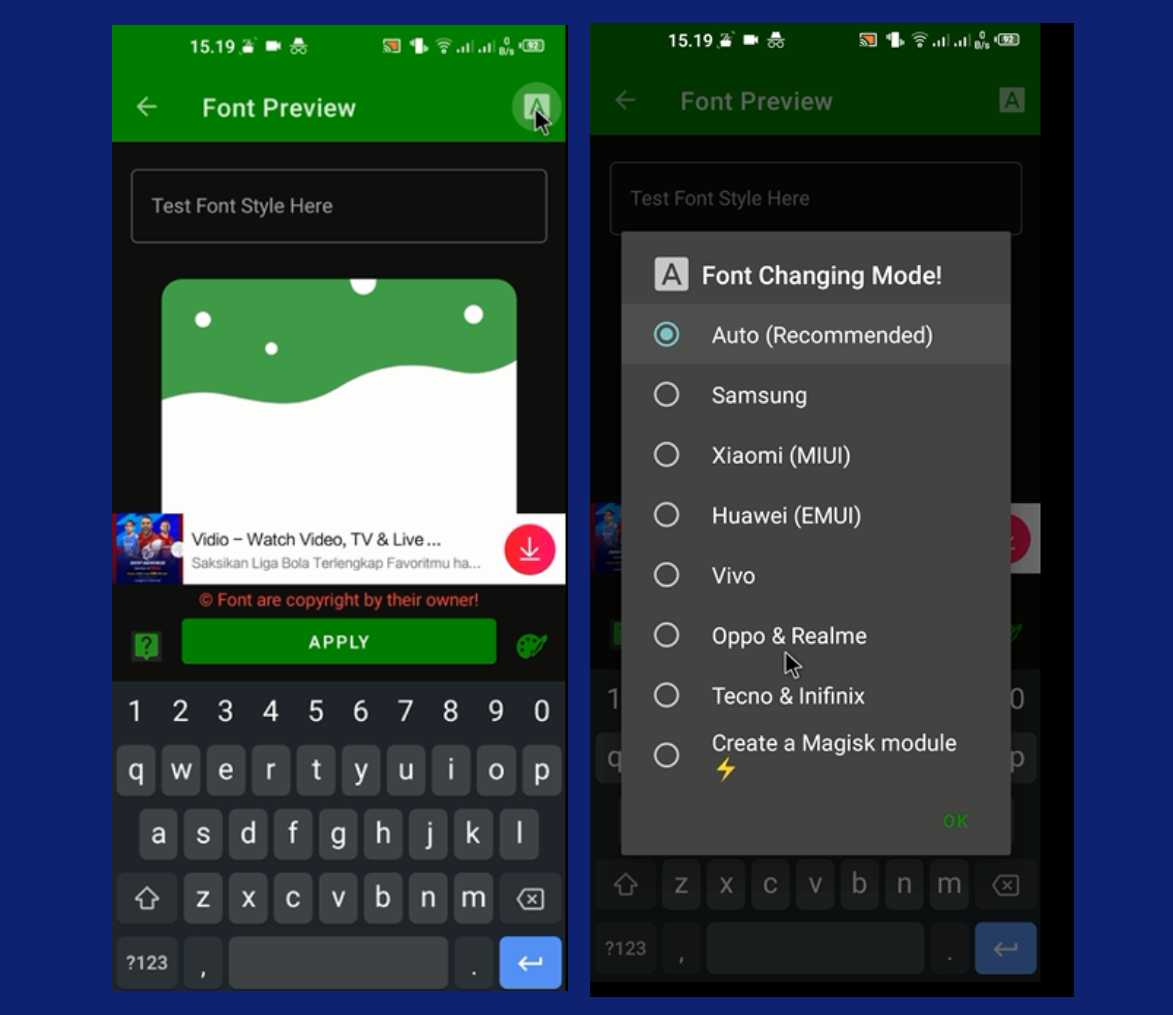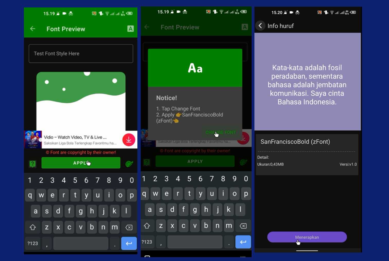 8. Silahkan pilih APPLY, CHANGE FONT, Menerapkan. Tunggu hingga proses menerapkan font pada HP selesai dan setelah itu font telah berhasil diubah.