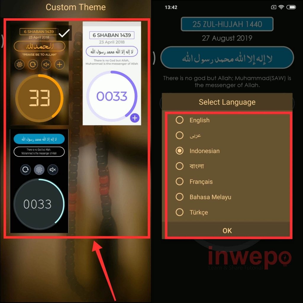 2. Buka aplikasi tasbih yang telah terinstall lalu pilih tema yang akan kamu gunakan. Selanjutnya pilih bahasa Indonesia.