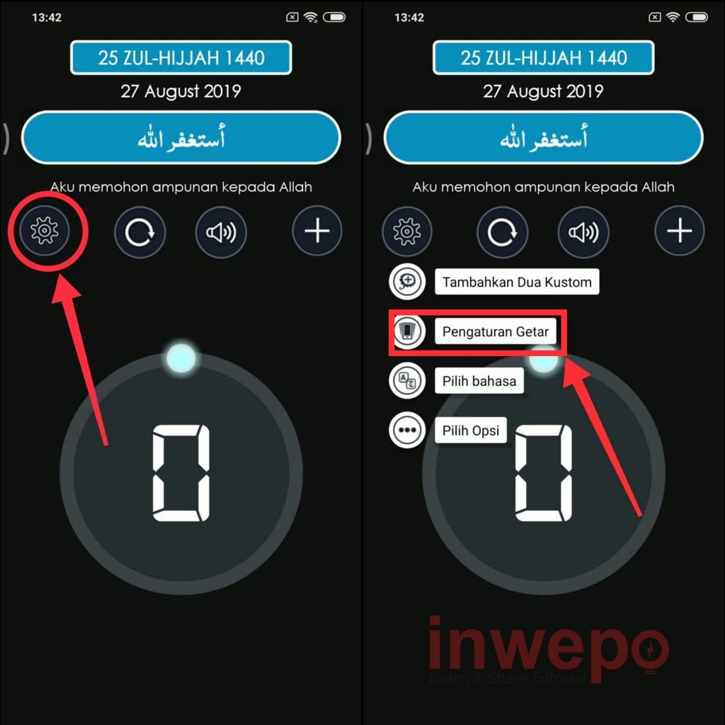 4. Tap icon gear untuk memunculkan pengaturan kemudian pilih menu pengaturan getar untuk mengatur getaran pada setiap pencapaian dzikir yang diucapkan.