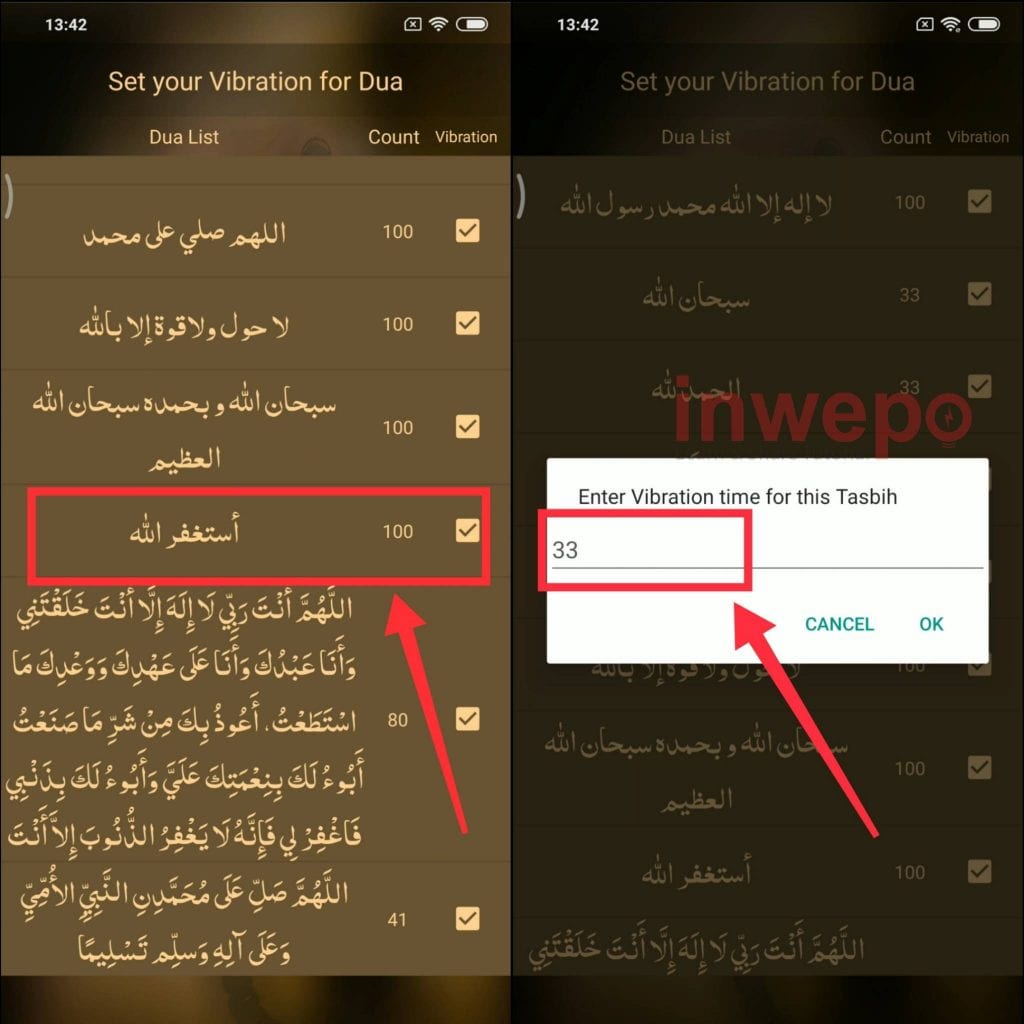 5. Pilih doa dzikir dan masukkan nominal counter untuk getaran ketika ketukan dzikir mencapai nominal yang kita setting.