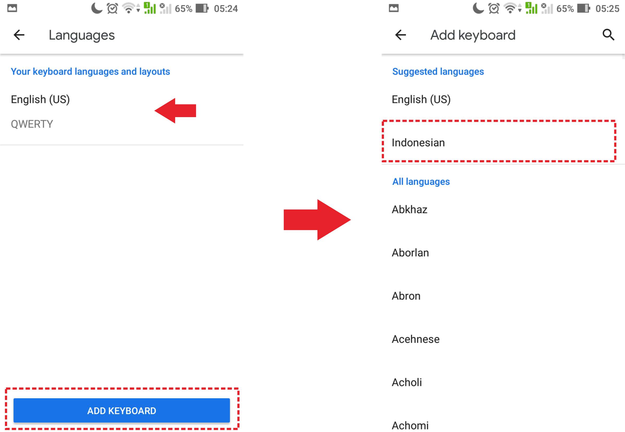 2. Pada menu languages ini, secara default hanya terdapat satu jenis layout saja yaitu English (US) yang mode Qwerty. Pilih add keyboard untuk menambahkan bahasa keyboard baru. Langkah selanjutnya disini penulis mencontohkan mengambil bahasa Indonesia.