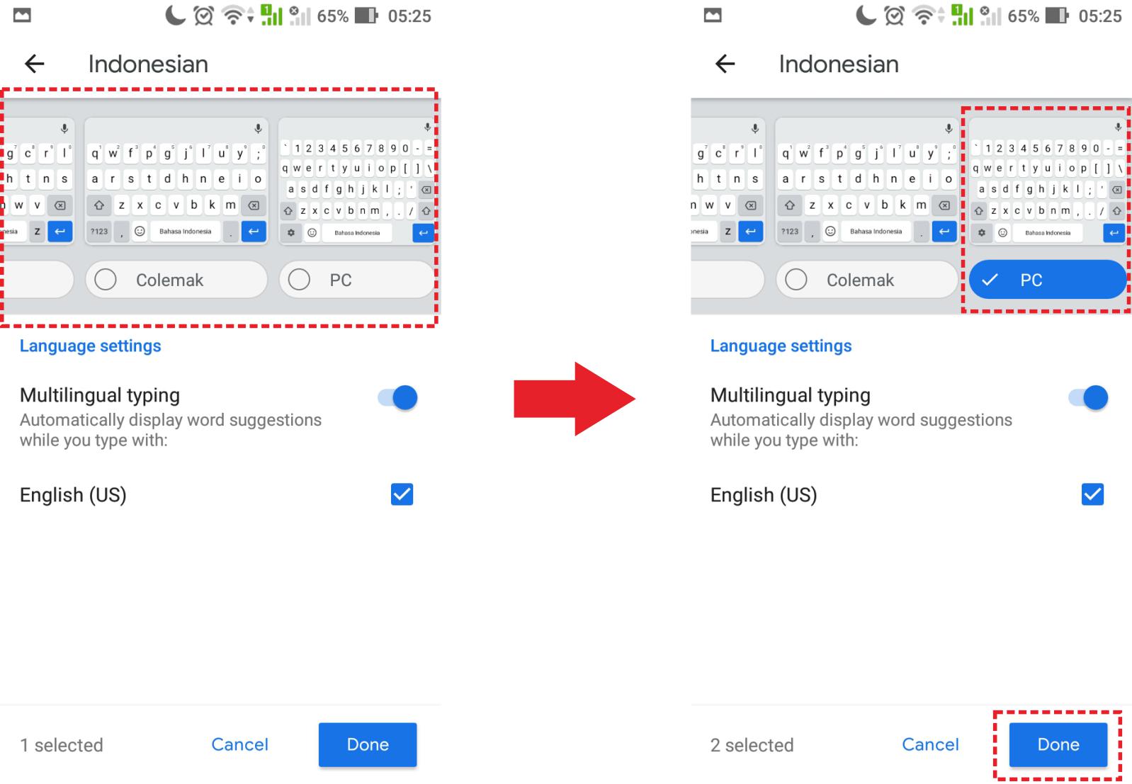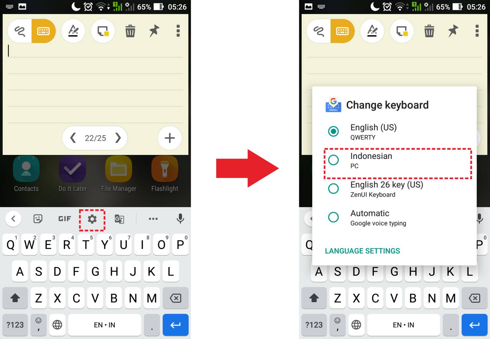 4. Untuk mengaktifkannya, buka tampilan google keyboard di layar tulis, kemudian pilih logo pengaturan. Selanjutnya, pada menu change keyboard, pilih layout Indonesian PC.