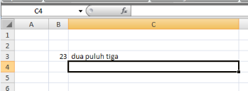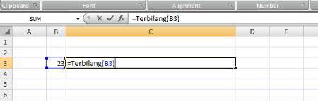 9. Selesai, sekarang kita langsung mencobanya. Disini saya memiliki angka 23, dan saya ingin angka menjadi teks. Rumusnya: =Terbilang(B3). Artinya: ubah angka yang ada di sel B3 menjadi teks terbilang.