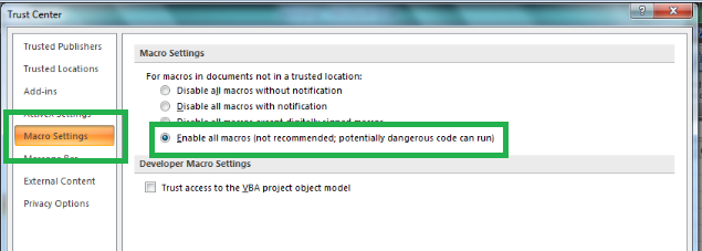 5. Di kotak dialog trust center pilih ‘Macro Setting’. Klik pilihan ‘Enable all macro’ -> klik ok.
