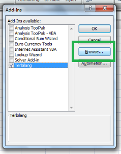 8. Terakhir, kita hanya perlu memasukkan file text yang sebelumnya kita download. Di kotak dialog ‘Add-Ins’, pilih ‘Browse’.