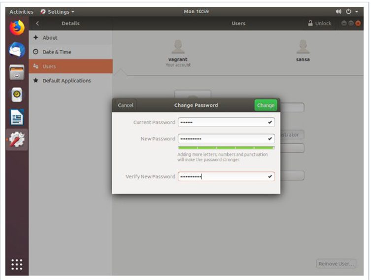 3. Masukkan kata sandi saat ini dan kamu dapat mengubah kata sandi baru lalu konfirmasikan. Kemudian “klik” Ubah untuk menyimpan perubahan. Bagi kamu yang menyukai baris perintah tampilan dari antarmuka grafis, kamu juga dapat menggunakan utilitas passwd untuk dapat mengubah kata sandi pengguna. Kamu hanya menuliskan nama pengguna atau users kamu sebagai keterangan.