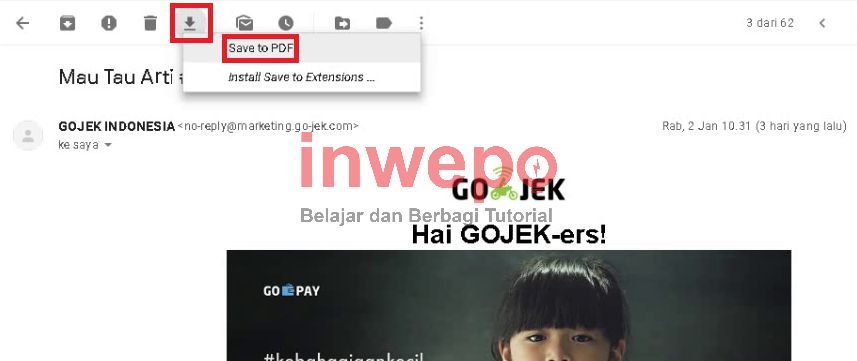6. Jika sudah, kamu akan dialihkan kembali ke halaman Gmail dan kamu klik salah satu email masuk dan dibagian atas judul email, akan ada tombol download dan kamu klik pada tombol tersebut dan klik pada tombol Save to PDF.