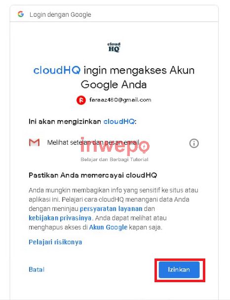 6. Maka akan muncul tampilan dimana ekstensi membutuhkan informasi email kamu (nama dan email saja) dan kamu klik tombol Izinkan.