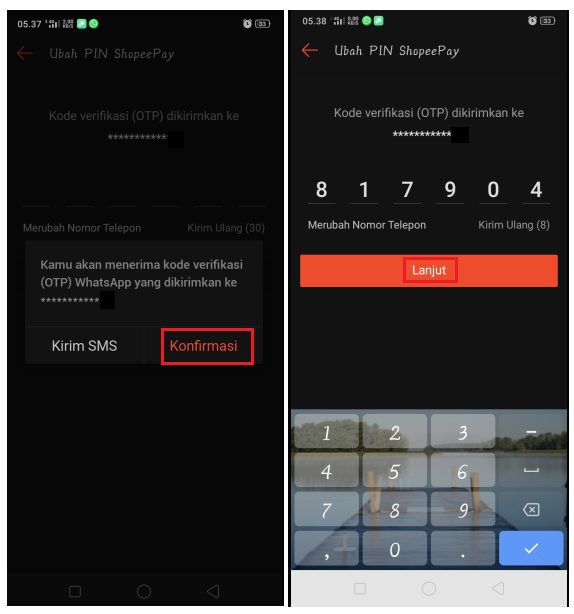 5. Setelah itu, kamu akan menerima kode verifikasi (OTP) melalui aplikasi WhatsApp. tap tombol Konfirmasi untuk menerima kode OTP. Kamu juga bisa menerima kode OTP melalui SMS, tap tombol Kirim SMS untuk mengirimkan kode OTP melalui SMS. Ketikkan kode OTP yang diterima pada kolom yang sudah disediakan dan tap tombol Lanjutkan. Perlu diingat bahwa kode OTP akan berubah setiap kali kamu menerima kode OTP.