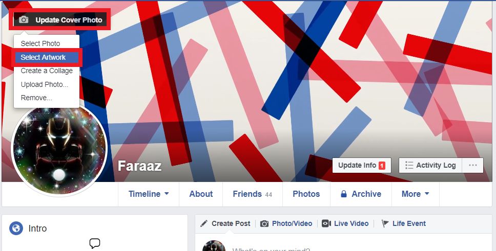 2. Lalu kamu arahkan mouse ke sudut kiri atas dari cover akun Facebook kamu dan akan muncul tombol untuk mengunggah cover baru, kamu klik pada tombol Select artworks.
