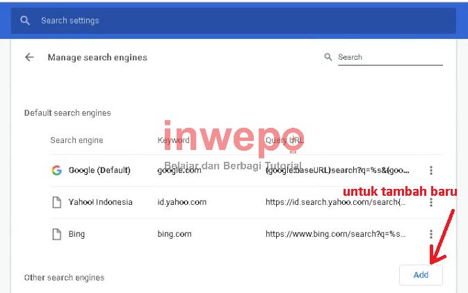 5. Jika kamu ingin menambahkan sendiri search engine yang kamu inginkan, kamu klik Add dan kamu isi informasi-informasi mengenai search engine tersebut.