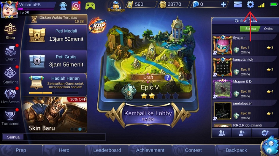 2. Buka game Mobile Legends, dan masuk ke menu setting atau lambang gear di pojok kanan seperti gambar di bawah.