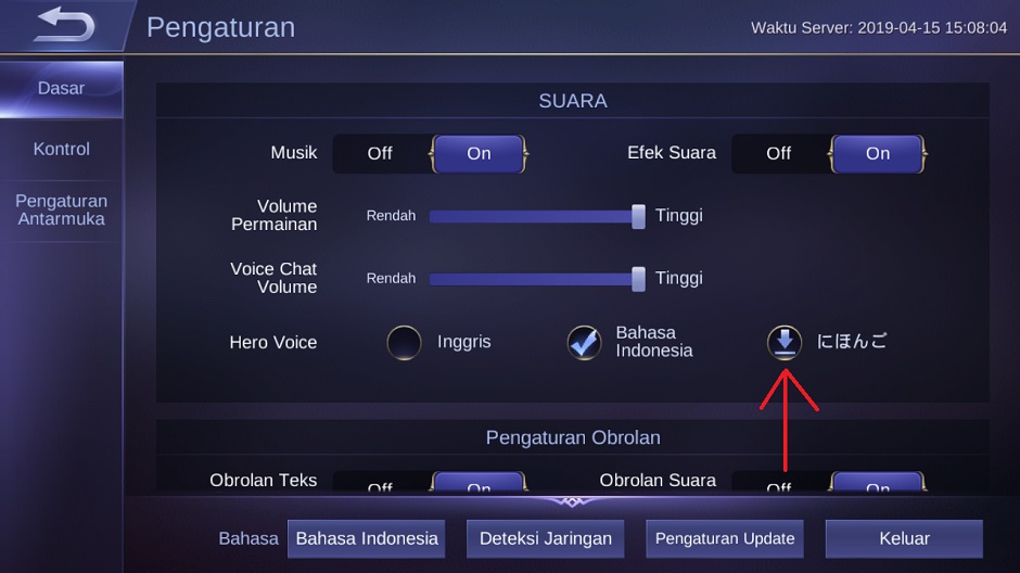 3. Pada menu Basic, scroll ke bawah sama bertemu dengan Sound lalu pada Hero Voice, pilih yang Bahasa Jepang (dalam tulisan Jepang).