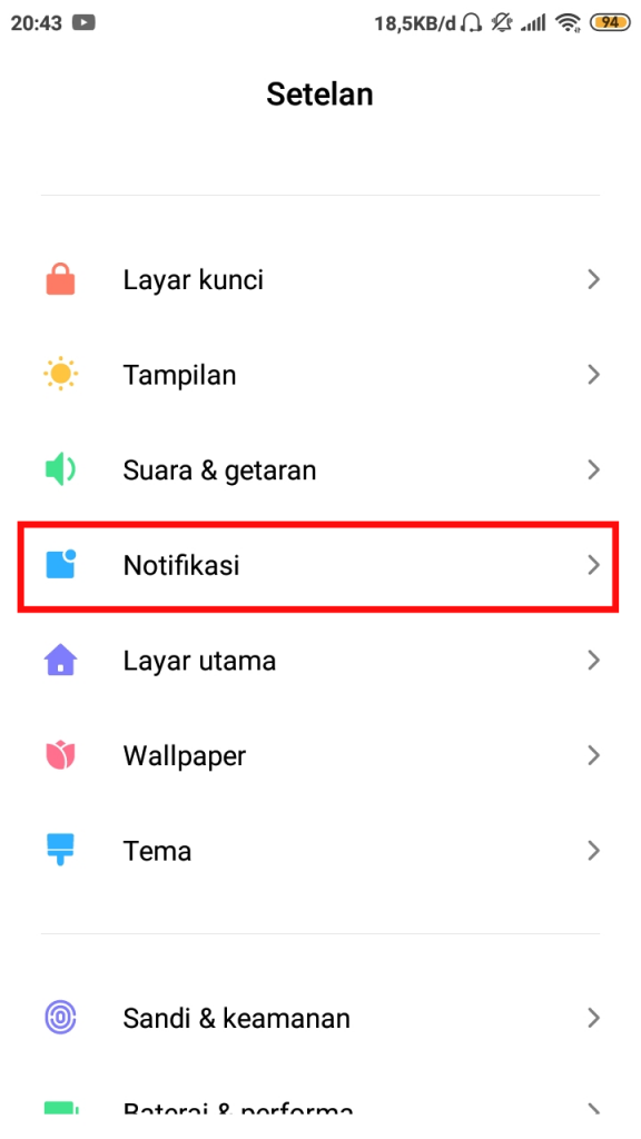 3. Pada halaman Notifikasi, pilih opsi Bar Notifikasi yang berada tepat di tengah halaman pengaturan.