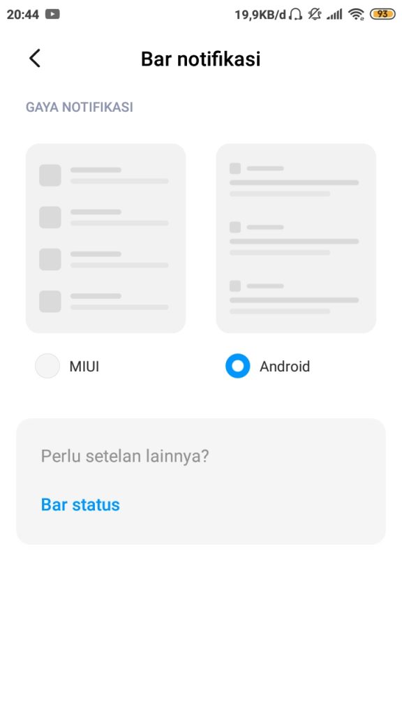 4. Pada halaman Bar Notifikasi, pilih gaya notifikasi yang kita inginkan. Secara bawaan, MIUI menggunakan gaya notifikasi Android (format standar; berlaku pada semua perangkat Android) agar pengguna dapat lebih fokus dengan konten notifikasi, dimana gaya notifikasi MIUI mengedepankan tampilan ikon dan minim tulisan.