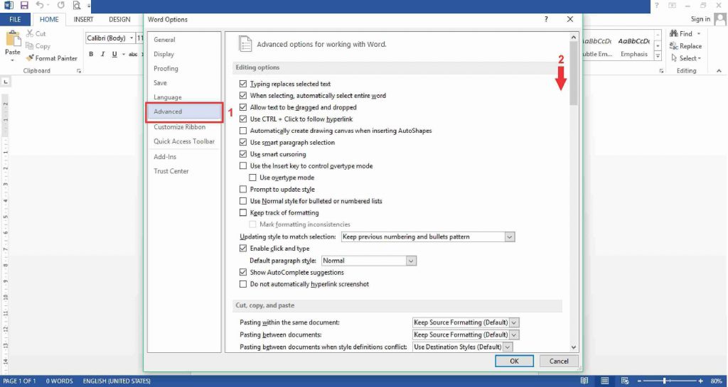 5. Pada menu options, pilih Advanced dan scroll pengaturan ke bawah.