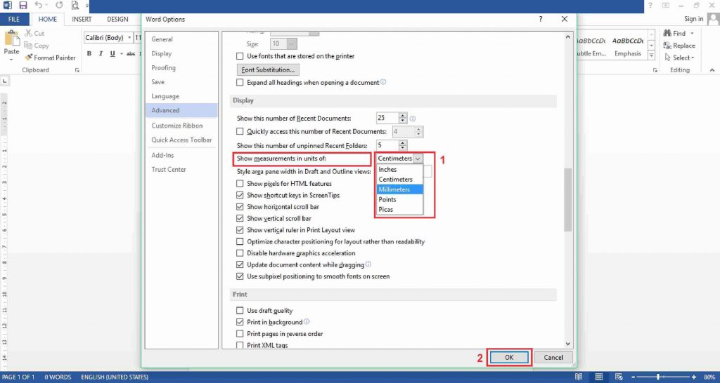 6. Pada tab display, tepatnya pada sub menu “show measurements in units of”, tentukan ukuran unit yang ingin dipakai dan kemudian klik OK.