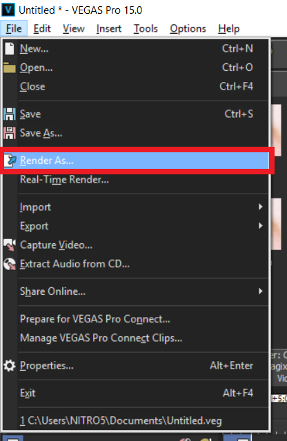 2. Jika kamu sudah membuka lembar kerja sony vegas kamu, kamu klik pada menu tab File – Render as.