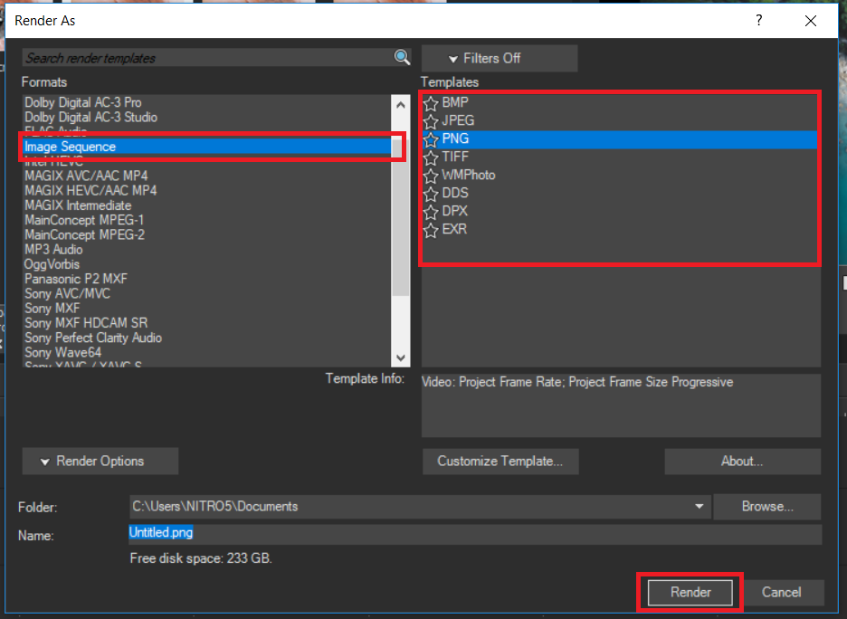 Catatan : Sistem perubahan video pada sony vegas menjadi image sequence adalah dengan mengekstrak setiap frame pada lembar kerja kamu dan diubahnya menjadi dalam bentuk gambar, jika misalnya kamu memiliki durasi video 3 detik, maka 30 * 3 = 90 foto, kenapa dikali 30? Karena rata rata video yang digunakan pada berbagai kamera adalah 30 FPS (frame per second).