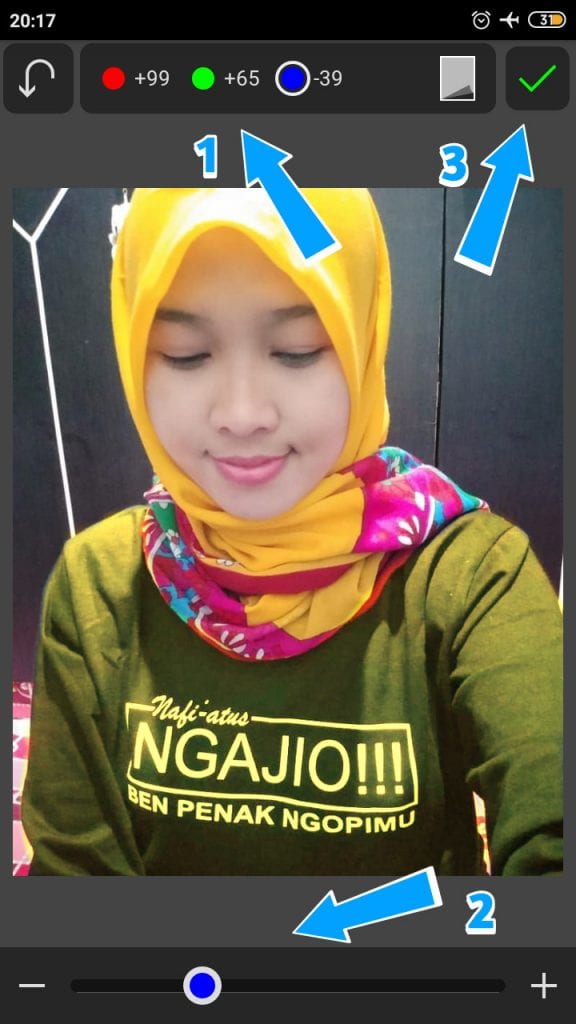 7. Nah hampir selesai, disini langsung saja kita beri pewarnaannya dengan cara klik ketiga warna di atas yakni yang berwarna merah, hijau dan biru. Lalu kamu dapat mengatur pewarnaannya semau kamu deh, dengan cara mainkan contrast di bagian bawahnya.