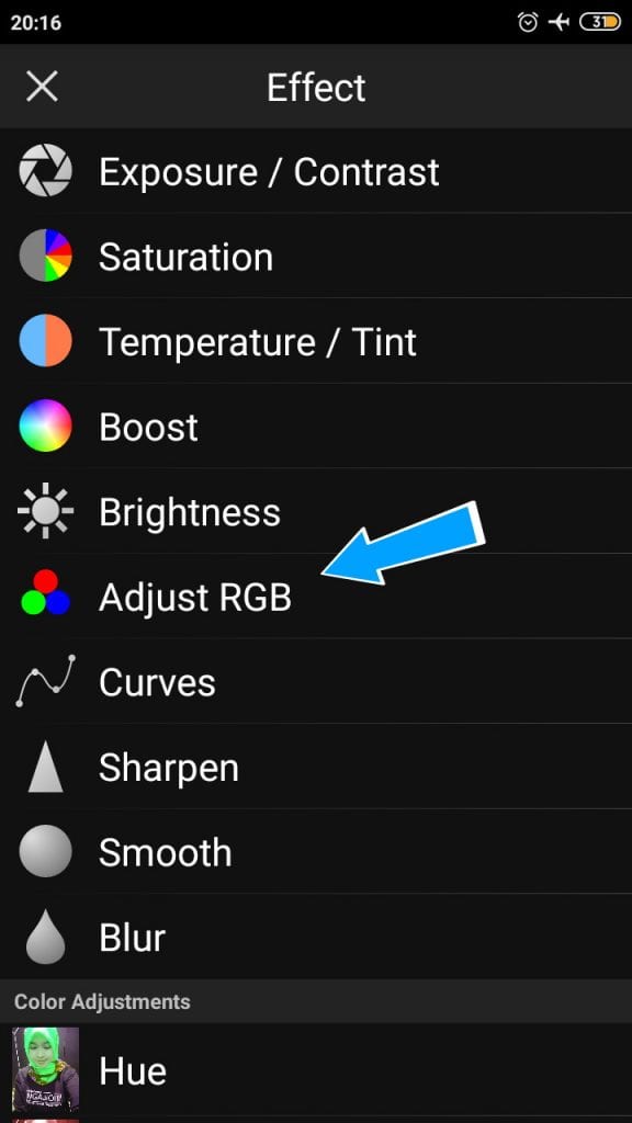 6. Otomatis kita dialihkan di menu Effect, maka langsung saja kita pilih menu Adjust RGB.