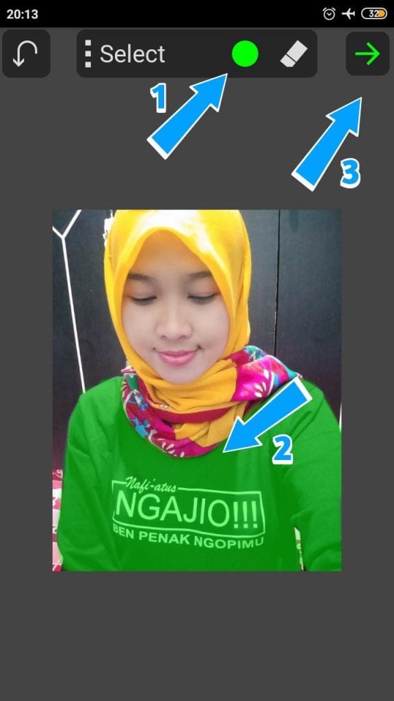5. Jika sudah, langsung saja kamu klik icon bulat di atas, jika sudah di klik maka akan warna hijau. Selanjutnya kita poleskan saja di bagian baju, jika sekiranya sudah bagian baju kita poleskan, langsung saja kamu klik ikon panah hijau di kanan pojok atas.