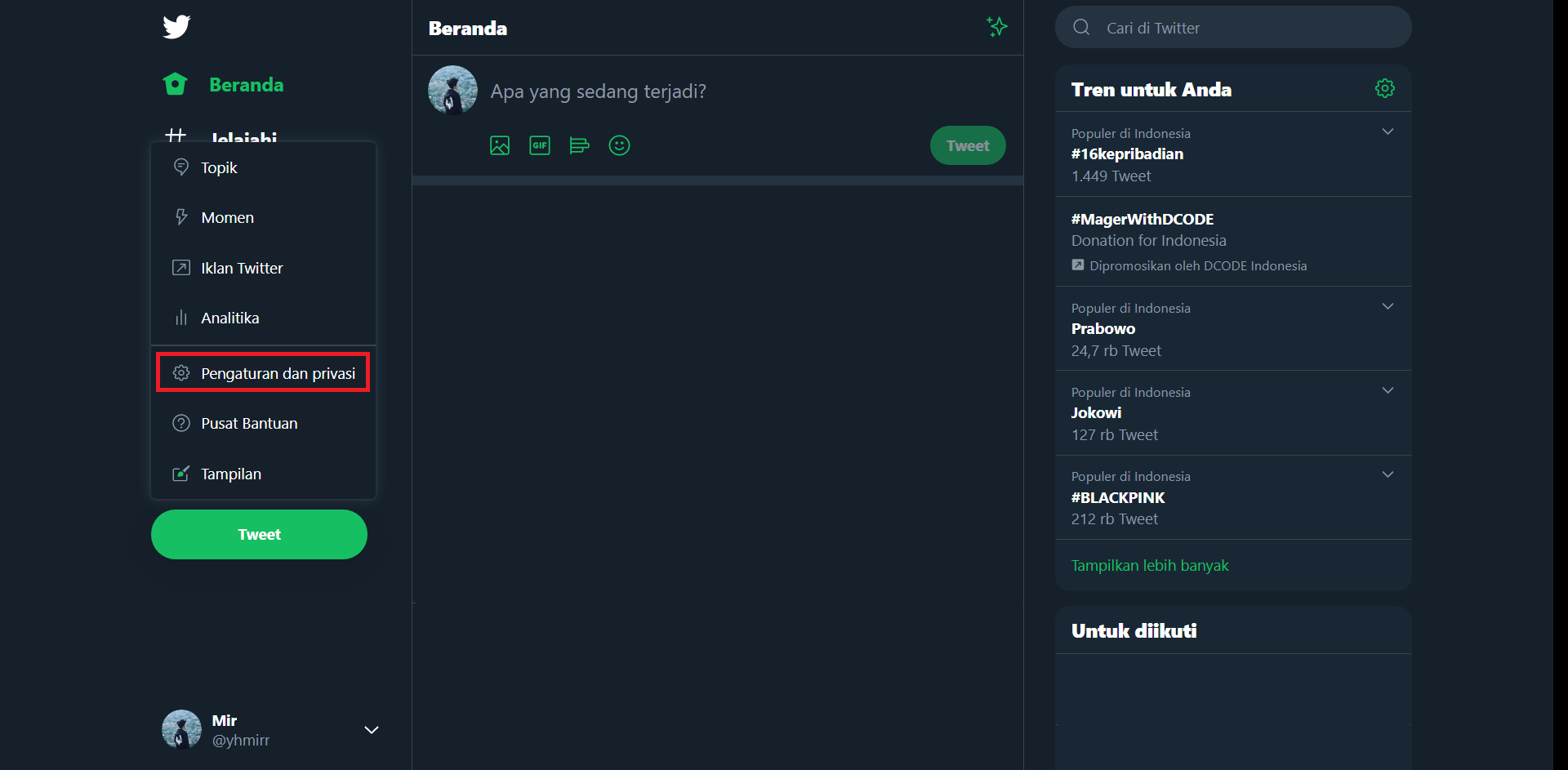 2. Tekan pilihan selengkapnya pada sisi kiri halaman dan pilih “Pengaturan dan Privasi”.