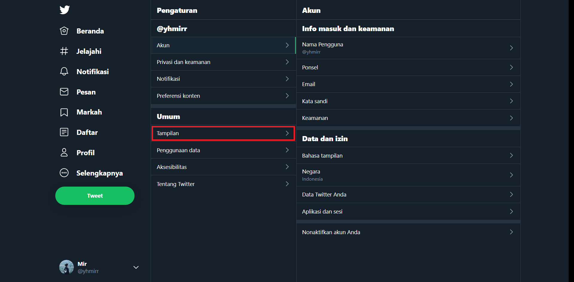3. Halaman akan diarahkan ke halaman pengaturan. Pada sisi pengaturan, kita pilih menu “Tampilan” pada bagian Umum.