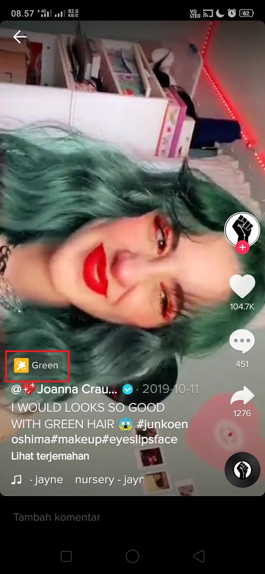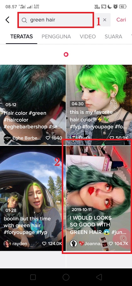 3. Berikut hasil pencarian dari kata kunci green hair. Pilih dan klik salah satu creator yang sudah memakai fitur ini.