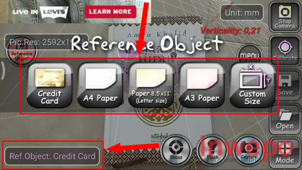 3. Tap menu Ref. Object (Reference Object) kemudian pilih objek yang menjadi referensi kamu bisa kartu kredit, kertas A3, atau mengkustom sendiri.
