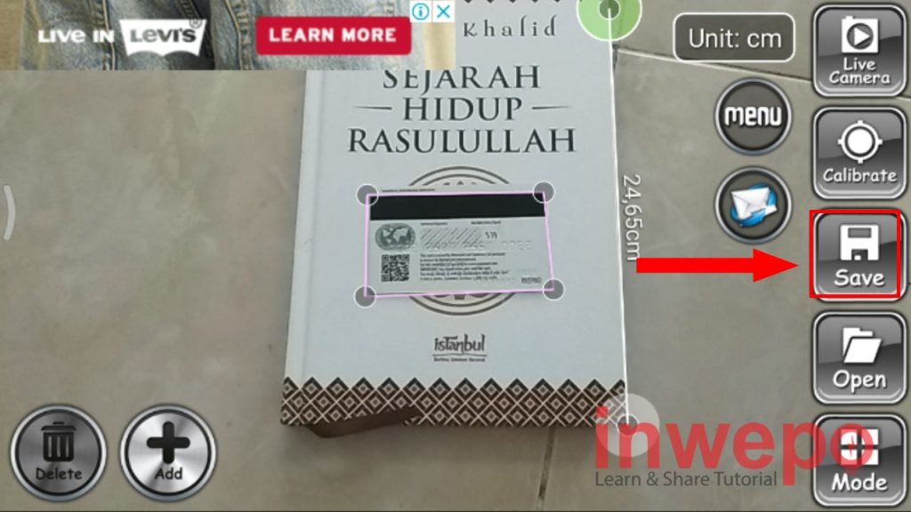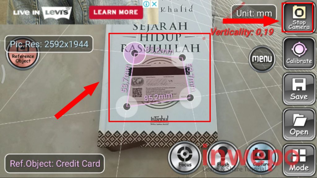 4. Letakkan objek referensi ke atas benda yang akan di ukur, lalu tap Stop Camera dan sesuaikan 4 point bundar pada objek referensi.
