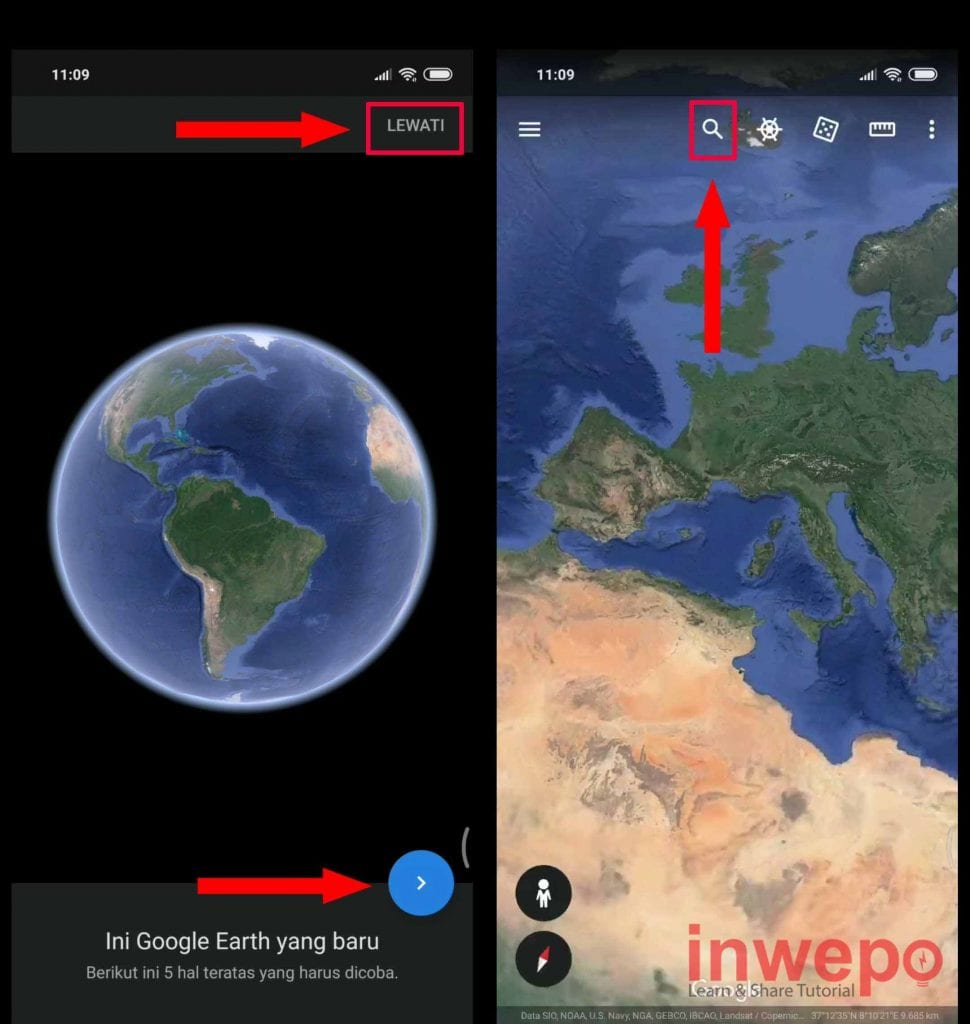 2. Langsung buka aplikasi Google Earth lalu tap Lewati atau icon panah yang berada di bagian bawah. Selanjutnya tap icon search yang berada di bagian atas untuk mencari wilayah.