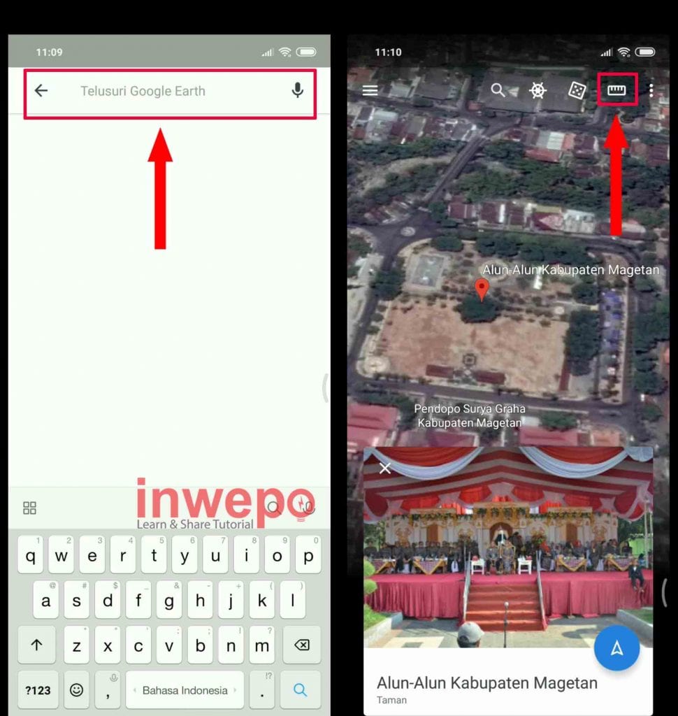 3. Tulis wilayah yang ingin kamu cari pada kolom pencarian. Beberapa saat kemudian Google Earth akan langsung memetakan wilayah yang kamu cari. Untuk mulai mengukur, tap icon measure atau penggaris.