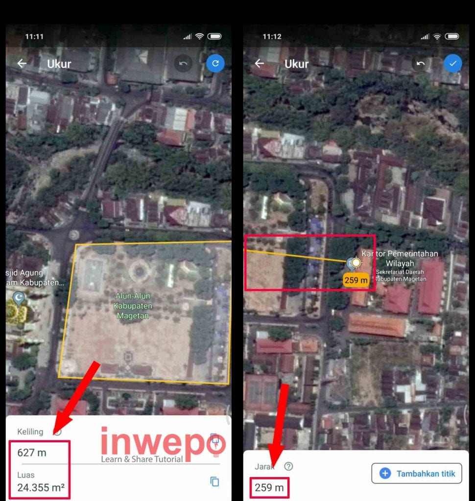 5. Kita akan mendapatkan data keliling area dan juga luas area di bagian bawah. Untuk mengukur jarak kamu tinggal menentukan titik daerah A kemudian tarik garis lurus menuju daerah B, maka di bagian bawah juga akan tertera jarak antar kedua daerah tersebut.