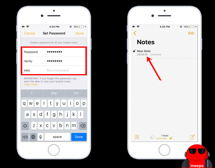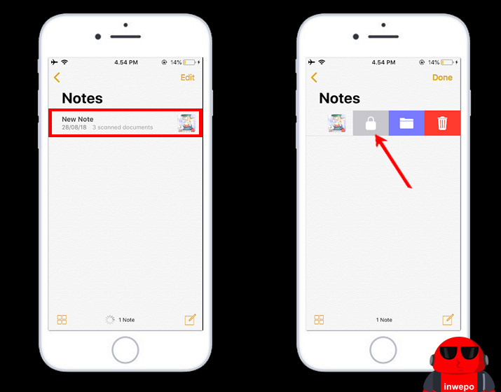 1. Buka aplikasi Notes – Swipe ke kiri – ketuk ikon Kunci.