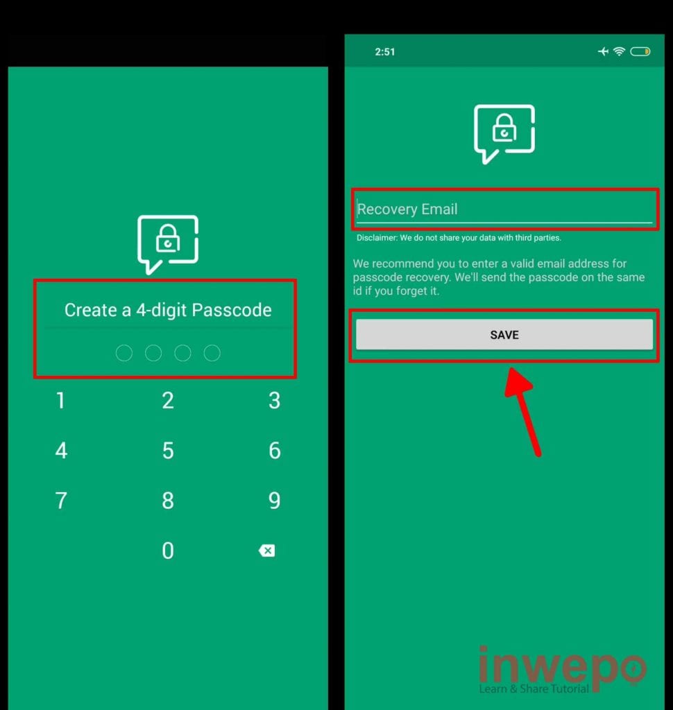 2. Buka aplikasi Locker for Whats Chat kemudian kamu akan langsung diminta untuk membuat 4 digit passcode. Selanjutnya atur recovery email bila sewaktu-waktu lupa passcode yang sudah di buat lalu tap SAVE.