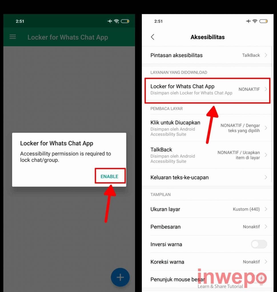 3. Akan muncul pop up langsung saja tap ENABLE lalu pada menu aksesibilitas pilih saja Locker for Whats Chat.