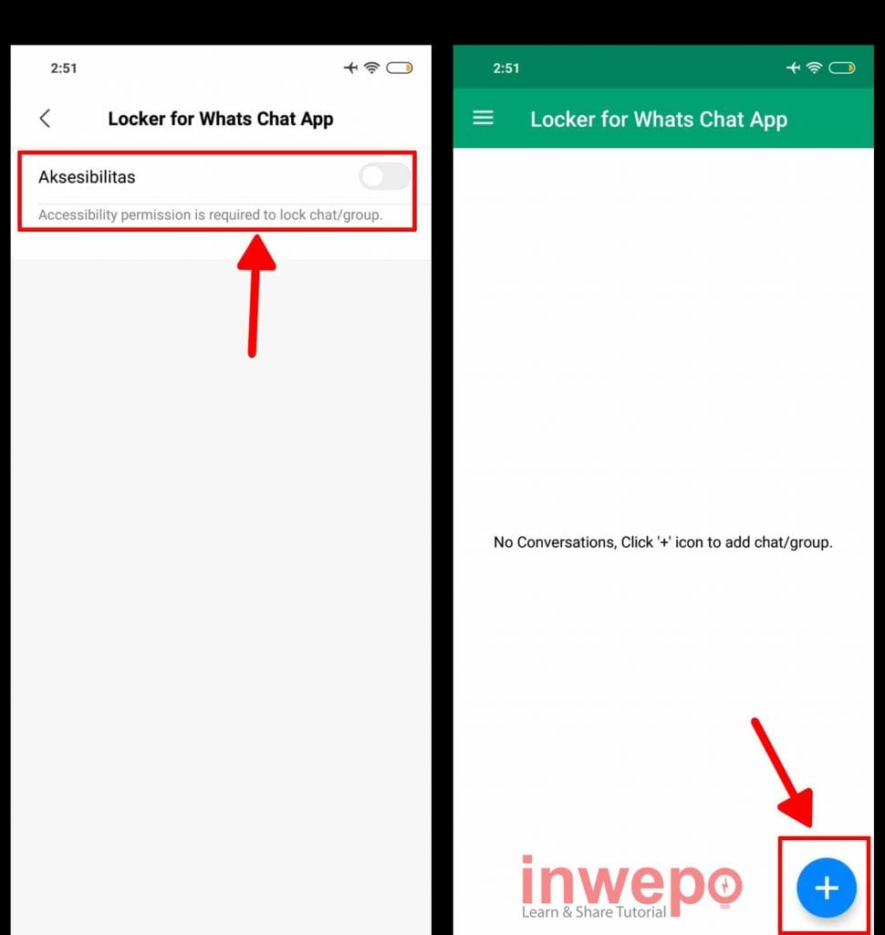 4. Aktifkan tombol aksesibilitas dari Locker for Whats Chat kemudian pada layar awal tap icon plus untuk mulai menambahkan grup untuk di kunci.