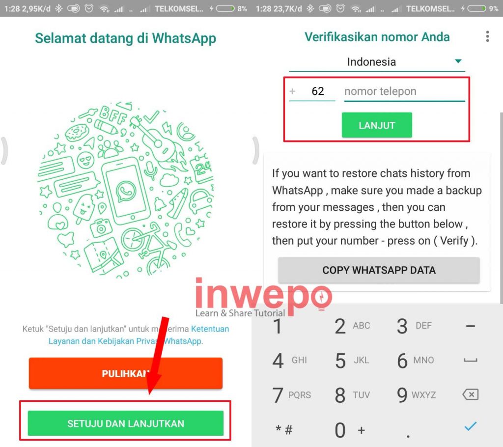 2. Kemudian masukkan nomor telepon seluler kamu untuk proses veritifikasi masuk ke WhatsApp.
