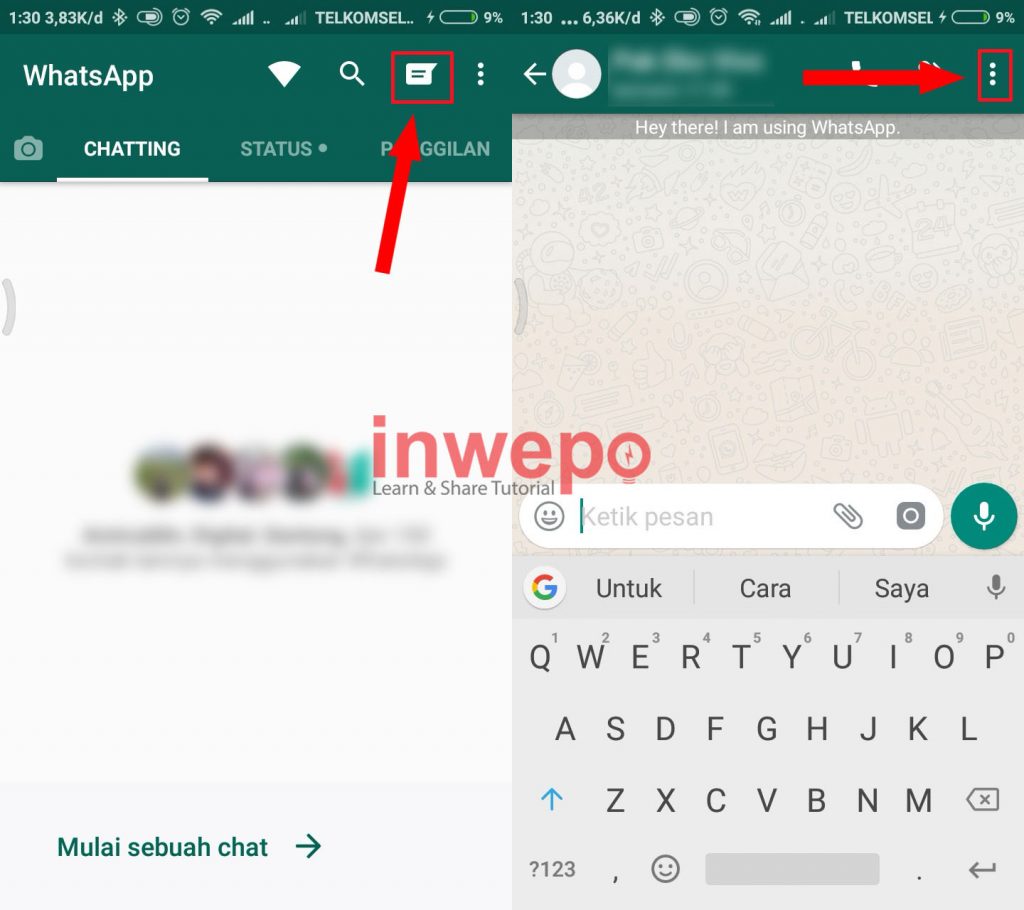 3. Buat obrolan chat baru dengan teman atau bisa juga membuka obrolan chat yang sudah ada, lalu tap 3 titik yang berada di pojok kanan atas di bagian percakapan.