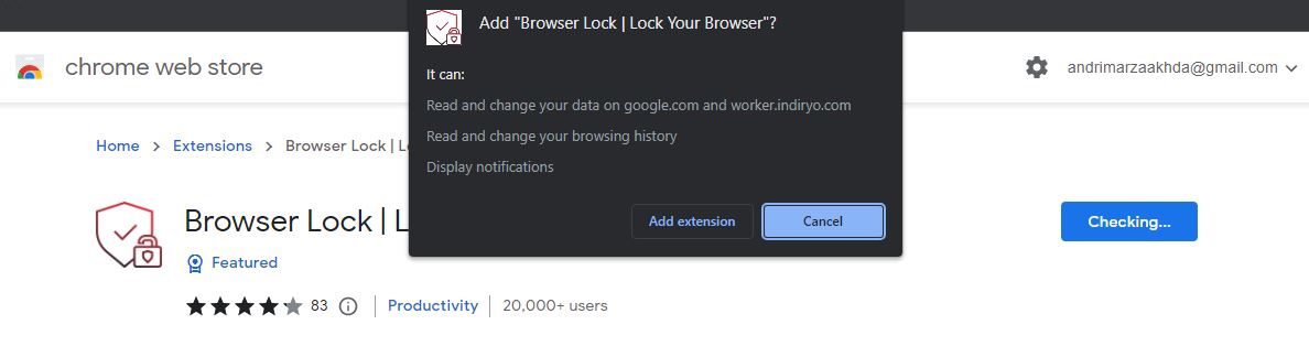 3. Setelahnya tekan tombol Add to Chrome, dan pada saat notifikasi JavaScript muncul, pilih Add extension untuk benar-benar menambahkan Browser Lock | Lock Your Browser menjadi extension Chrome kamu.
