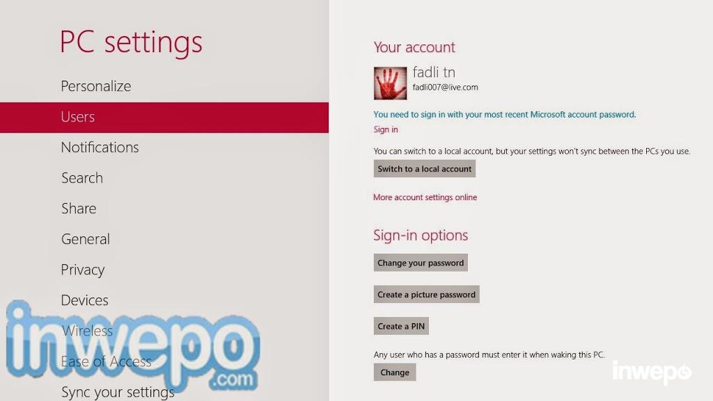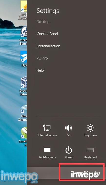1. Pertama kita harus membuat password terlebih dulu masuk ke settings (geserkan cursor di desktop ke pojok kanan bawah) > change PC settings > create password.